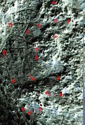 A series of interesting formations on the martian surface ... but what exactly are they? And what is the cause of the numerous light sources in the image? Also within the image appears clear reflections of the formations on what is seemingly a liquid surface. There seems to be strong evidence within this image of life forms.Quotes ... for today