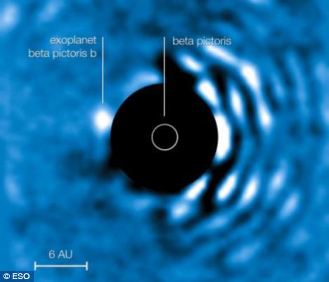 Astronomers have developed a way to see planets previously hidden in their star's glare. The breakthrough will enables scientists to search for planets that are much closer to the star than has been previously possible. It makes it far more likely that Earth-like planets could be found close to stars in distant galaxies. Using new optics technology an international team of astronomers has obtained images of a planet on a much closer orbit around its parent star than any other extrasolar planet previously found. The discovery was published online in Astrophysical Journal Letters. Installed on the European Southern Observatory's Very Large Telescope, or VLT, atop Paranal Mountain in Chile, the new technology enabled an international team of astronomers to confirm the existence and orbital movement of a new planet. Beta Pictoris b is a planet about seven to 10 times the mass of Jupiter, around its parent star, Beta Pictoris, 63 light years away. The system works by using a small piece of glass with a complex pattern etched onto its surface. This Apodizing Phase Plate (APP) blocks out the starlight in a certain way, allowing planets to show up in the image whose signals were previously drowned out by the star's glare. (Daily Mail)